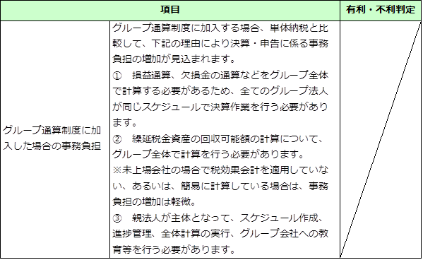 グループ通算制度に加入した場合の有利不利の判定は下記の通りです。