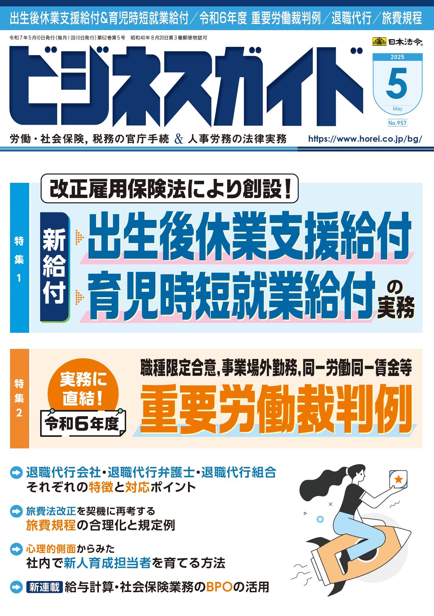 企業の総務・人事の実務担当者、社会保険労務士や弁護士等をメインターゲットとし、労働・社会保険や税務に関する官庁への届出手続や人事・労務にまつわる法律実務に関する記事を掲載している月刊誌「ビジネスガイド」に、CSアカウンティング代表取締役社長・中尾が社労士としての視点で執筆した記事が連載されています。4/10発売の2025年5月号より3号にわたる連載を予定しております。